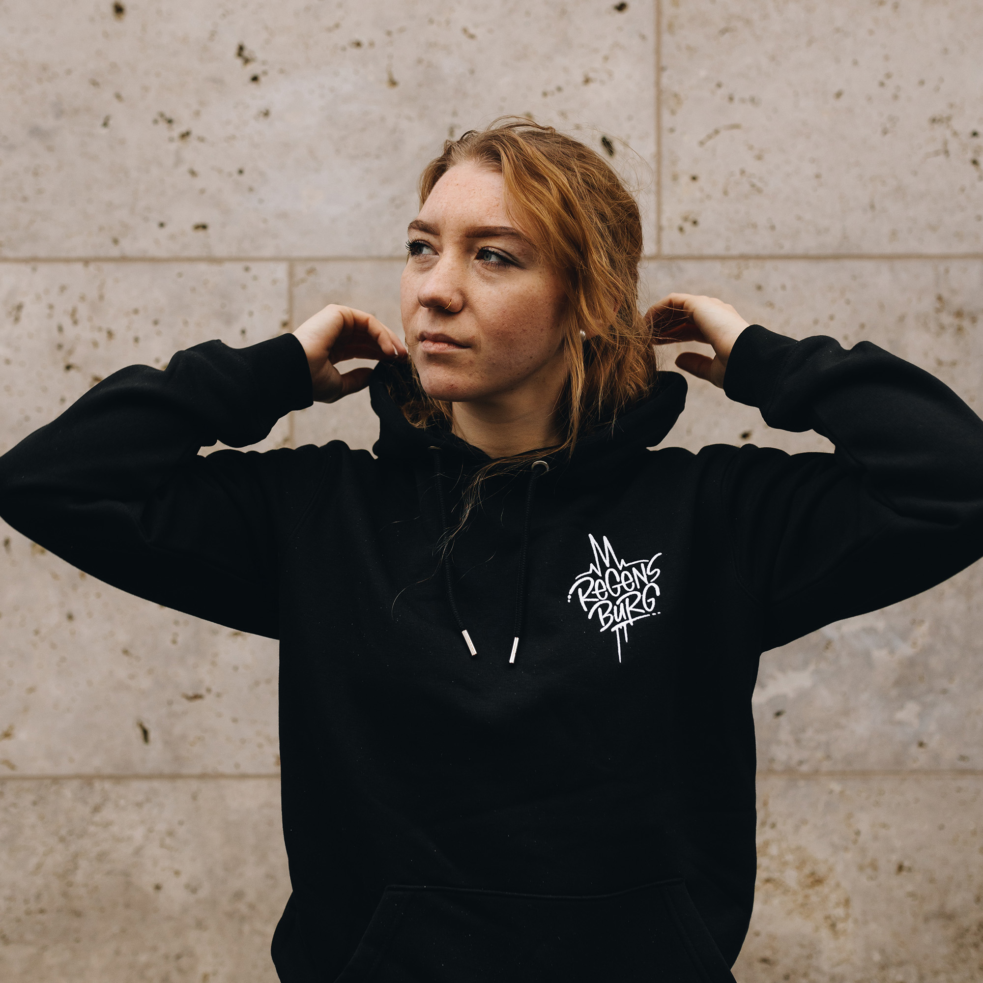 Schwarzer Hoodie 'Regensburg' in normaler Passform. Auf der Brust findet ihr einen schlichten 'Regensburg'-Schriftzug mit einer angedeuteten Skyline unserer Stadt als Stick in weißer Farbe.