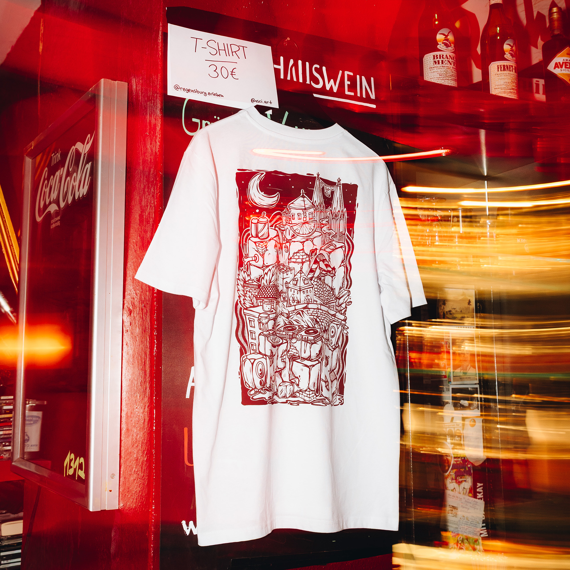 T-Shirt 'NO7' in normaler Passform. Das weiße Shirt wurde von uns mit individuellen Elementen für die No 7 Bar in der Gesandtenstraße gestaltet. Am Rücken findet ihr einen großen dunkelroten Backprint, vorn ein schlichtes Weinglas mit der charakteristischen 7.